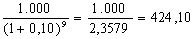 o valor presente dos US$ 1.000,00 a serem pagos daí a 9 anos, a 10% a.a., é: