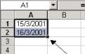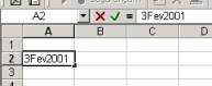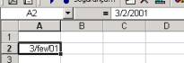 Note que na barra de fórmula (indicada pela flecha acima), o Excel interpreta a data entrada como 2/3/2001 [1] . Quando você reformatar a célula como Formatar|Células|Número|Geral, você vê que o Excel interpreta esta data como o número 36925, o número 1 sendo 1 de Janeiro 1 de 1900.