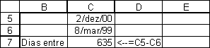 (A célula C7 inicialmente mostra uma data, mas foi então re-formatada com Formatar|Células|Número|Geral).