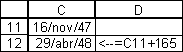 Você poderia também adicionar um número a uma data para encontrar outra data. Qual era, por exemplo, a data 165 dias após 16 de Novembro de 1947?