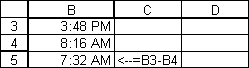 Você pode subtrair tempo exatamente como você subtrai datas; a célula B5 abaixo diz a você que 7 horas e 32 minutos se passaram entre dois instantes (ignore o “AM” na B5):