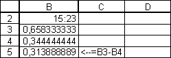 Quando você re-formatar as células acima com Formatar|Células|Número|Geral, você pode ver que os tempos estão representados no Excel como frações de um dia:
