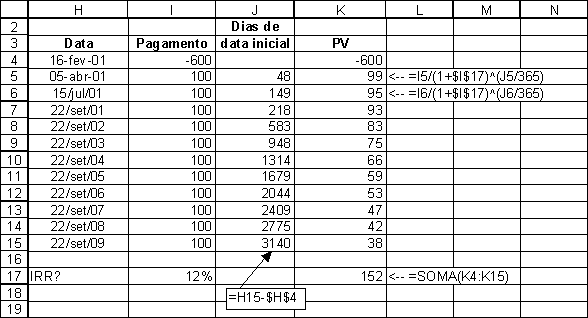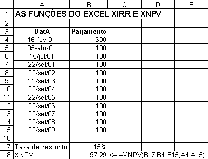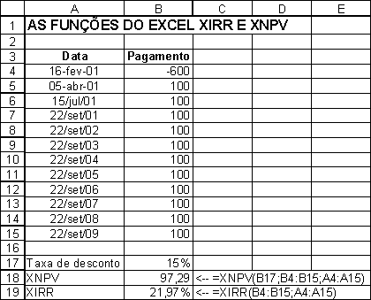 Aqui está um exemplo: Você paga $600 em 16 de Fevereiro de 2001 por um ativo que irá repor $100 em 5 de Abril, $100 em 15 de Julho de 2001, e daí $100 em cada 22 de Setembro de 2001 até 2009. As datas não são igualmente espaçadas, de modo que você não pode usar IRR. Com XIRR (célula B19 abaixo), você pode computar o IRR anualizado (a taxa de juros anual efetiva EAIR, como definida no Capítulo 2).