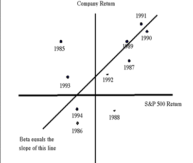 The relationship between the returns of the security and the market factor can be seen by plotting market returns on one axis and the returns for one company over the same period on the other.
