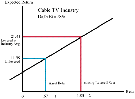The cable television industry is a utility. If we could observe an unlevered cable company, it would undoubtedly have a low beta. Good television reception is like food, people can't seem to live without it, even in a recession. Thus, it is not as cyclical as some other businesses. Empirical research has shown that the beta of the average all-equity cable TV company (called an asset beta) is .67, but most firms borrow more that their total equity value! Thus, the beta of their equity (that is, the beta measured by regression of stock returns on the market) is greater than one: 1.85. This increases the average expected return in the industry from 11.39 to 21.41.