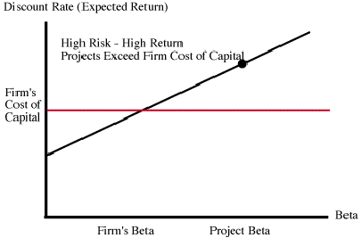 You will reject some worthwhile projects with low betas, and you accept high beta projects that make the firm riskier. You will end up selecting for exposure to systematic risk. What if you take projects below your company cost of capital? Doesn't this mean that you will be borrowing at a higher rate than your projects are yielding? No! Accepting lower beta projects will lower the expected return of the firm and thus lower the financing costs proportionally.