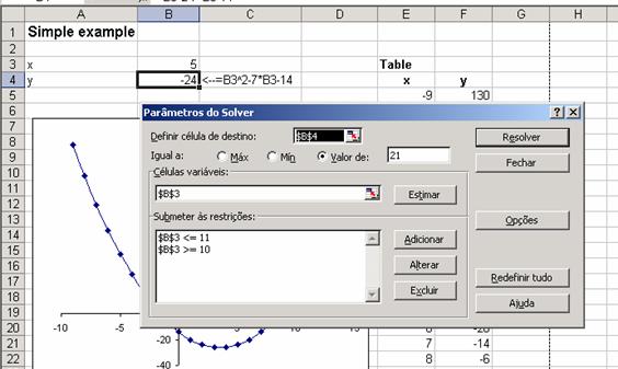 Podemos fazer o mesmo cálculo com o Solver. Na mesma planilha, vamos ao comando Ferramentas|Solver. Isto leva a uma caixa de diálogo que preenchermos como segue (note que mudamos um pouco a pergunta – desta vez queremos o valor de x que dá um y = -58):